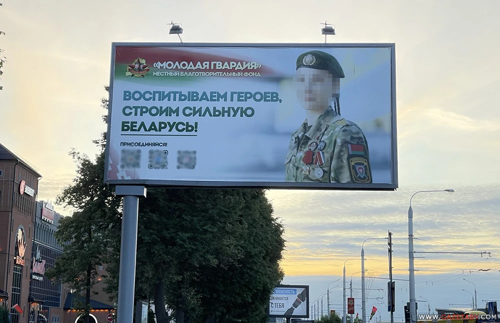 На минских улицах появились билборды с рекламой «патриотического» фонда «Молодая гвардия». На них изображены подростки в военной форме с наградами и призыв присоединяться к фонду.