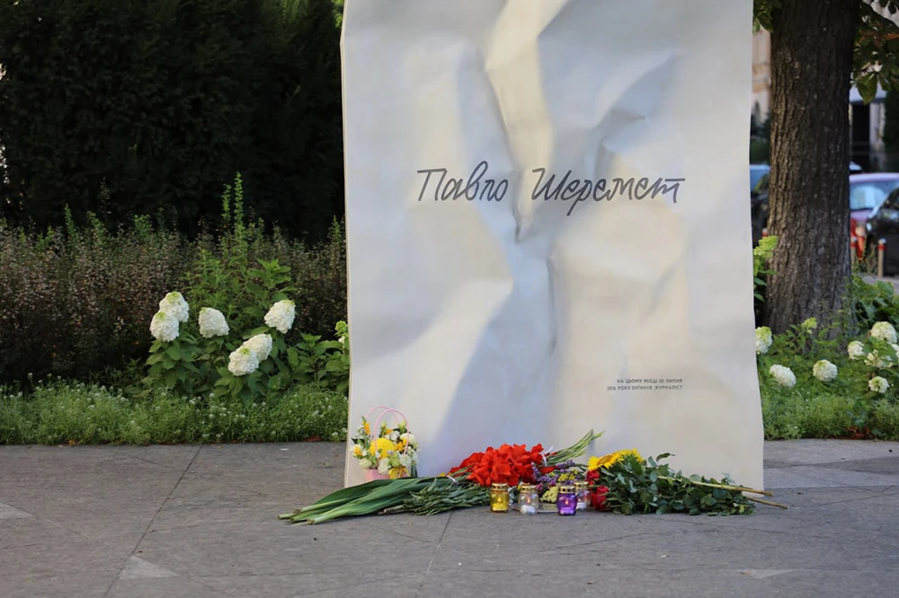 В четвертую годовщину гибели Павла Шеремета на месте его убийства в Киеве открыли мемориал в виде белого смятого листа бумаги.