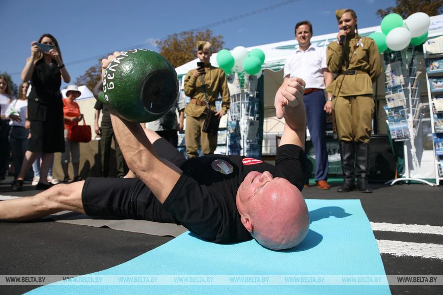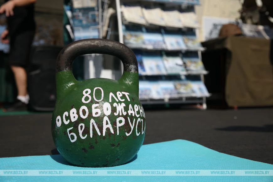 И гиревика Вячеслава Хоронеко, толкающего гирю в честь 80-летия освобождения Беларуси.