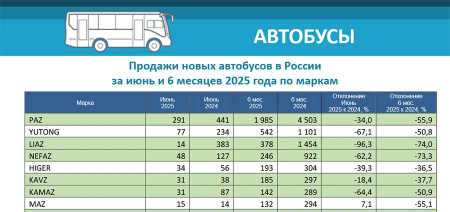 Так, в июне на российском рынке было продано 15 автобусов МАЗ, что на 1 единицу больше, чем в июне 2024-го. Но это очень слабое утешение, так падение по результатам первого полугодия составило 2,2 раза — 132 автобуса против 294 за аналогичный период прошлого года.
