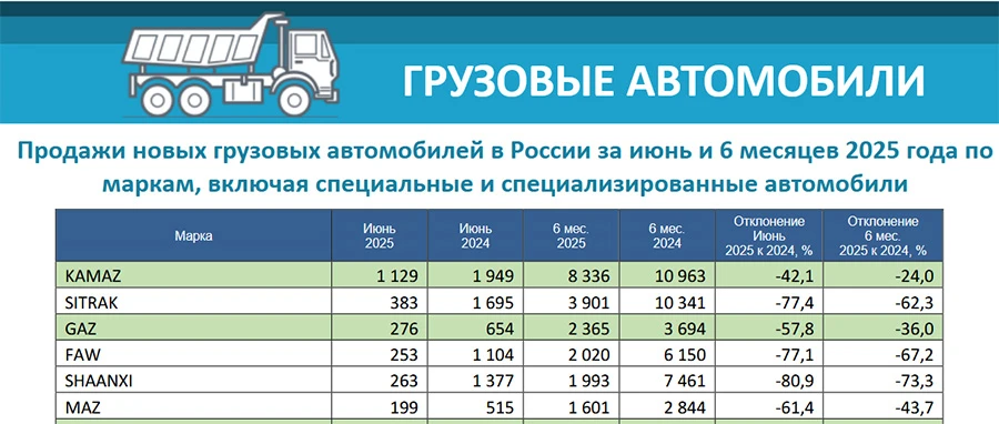 Не лучше выглядит ситуация и с грузовиками. За июнь их продали в России 199 единиц (515 в июне 2024-го), а с января по июнь 2025-го — 1601 грузовик (2844). Падение продаж по сравнению с июнем прошлого года составило –61,4%, а сравнение с первыми месяцами прошлого года выглядит так: –43,7%.