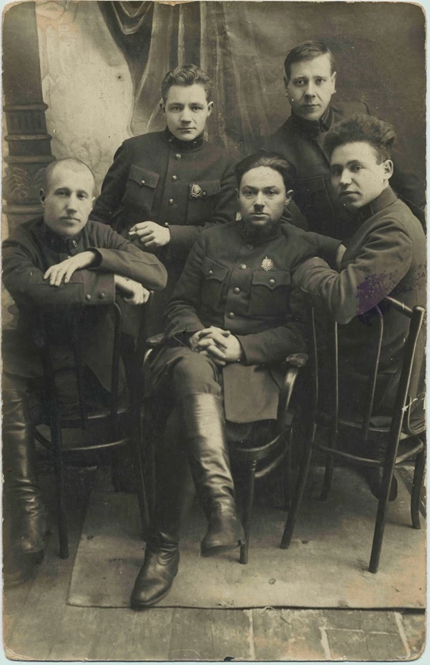 На меня также выходил внук дедушкиного сослуживца Ивана Кирилловича Козлова. Того можно видеть на снимке вместе с дедушкой — колоритный такой мужчина в центре фотографии. Это фото примерно периода Катынского расстрела.
