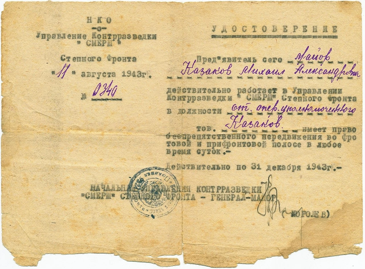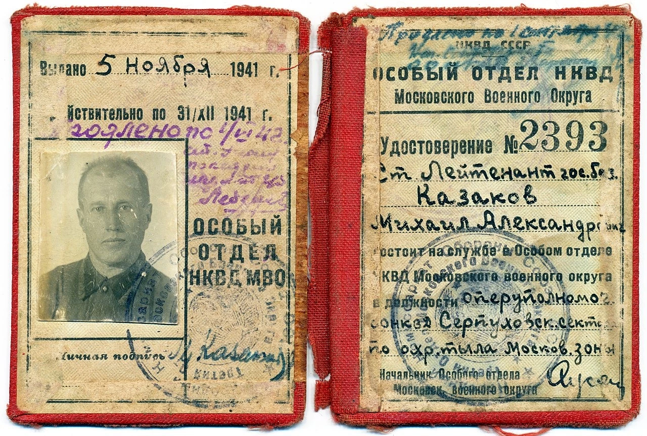 Во время обороны Москвы дед был старшим оперуполномоченный, а во время Сталинградской битвы — начальником полковой контрразведки СМЕРШ. Чудом сохранилось только одно удостоверение, хотя я видел их все. Моя вторая тетя, когда дед умер в 1982 году, первым делом пошла и сдала в КГБ наградное удостоверение на орден Ленина и удостоверения СМЕРШевца.
