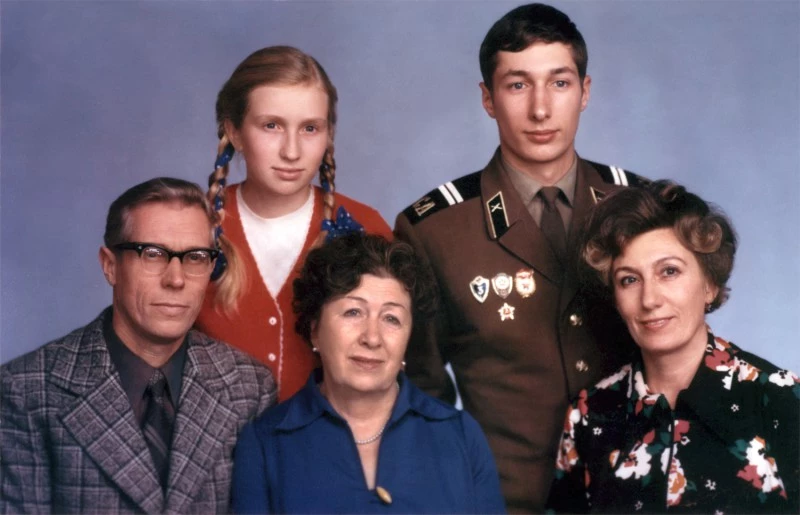 Первый ряд: Владимир Михайлович Казаков (папа Алексея), Зоя Васильевна Турбаевская (бабушка), Нонна Кирилловна Турбаевская (мама). Второй ряд: Оксана (сестра) и Алексей Турбаевский. Одесса, 1976 год