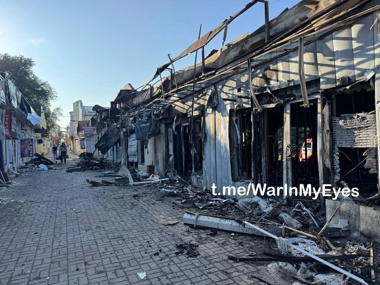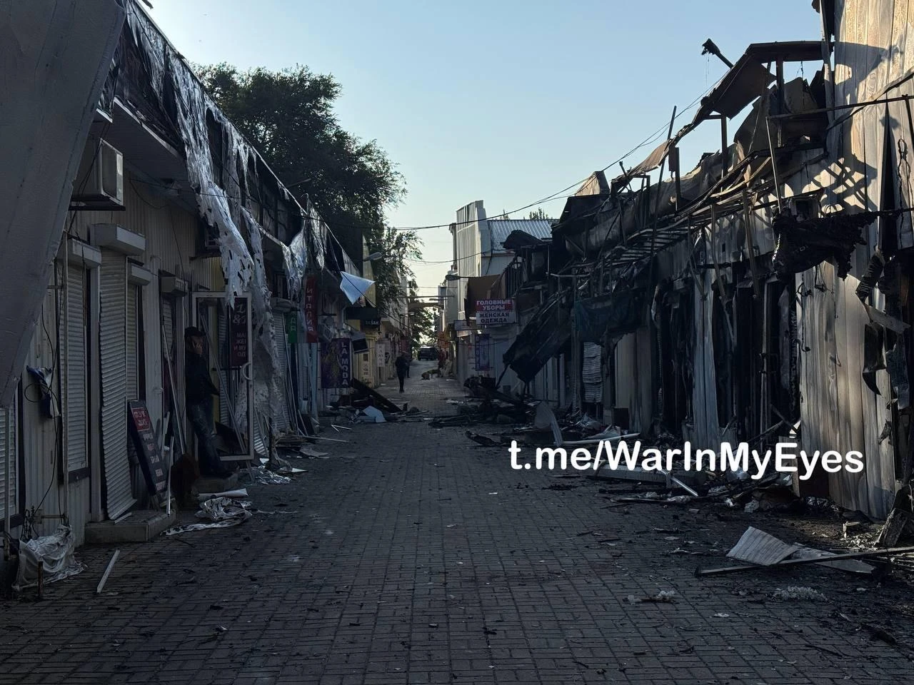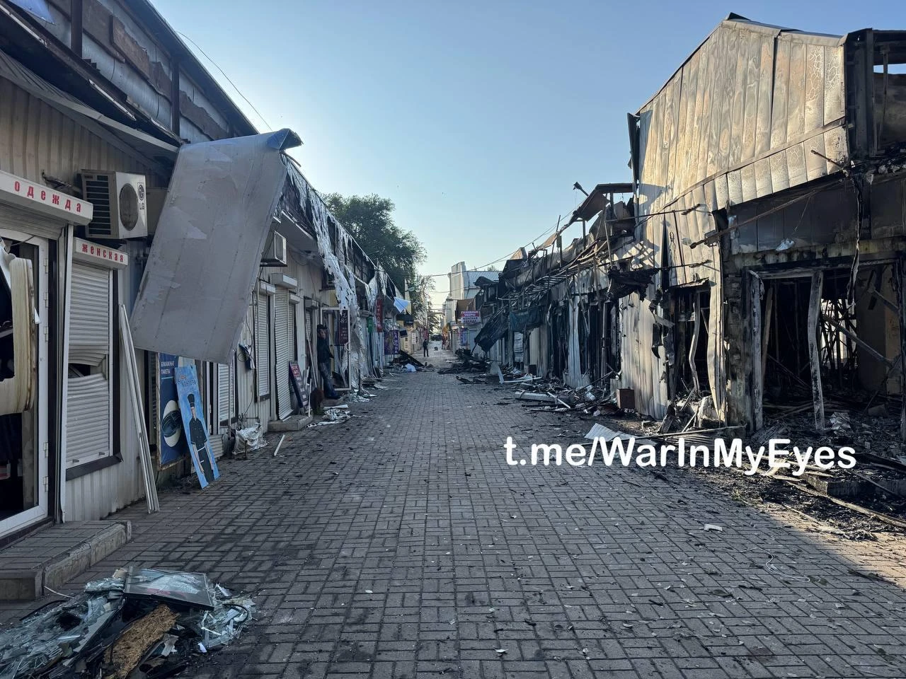Последствия прилета 30 июня по рынку в центре Донецка (в районе ЦУМа). Там погибла женщина.