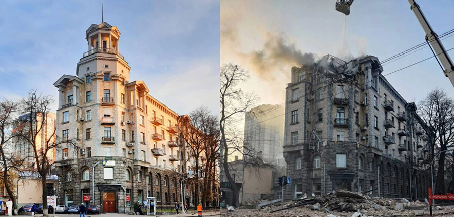 Вид на «дом Совнаркома» в центре Киева, разрушенный после сегодняшней атаки беспилотников на столицу. Если сравнить с его прежней фотографией, то видно, что полностью уничтожена его главная отличительная часть – ротонда на крыше. Также разрушены квартиры на верхних этажах, пишет Политика страны.