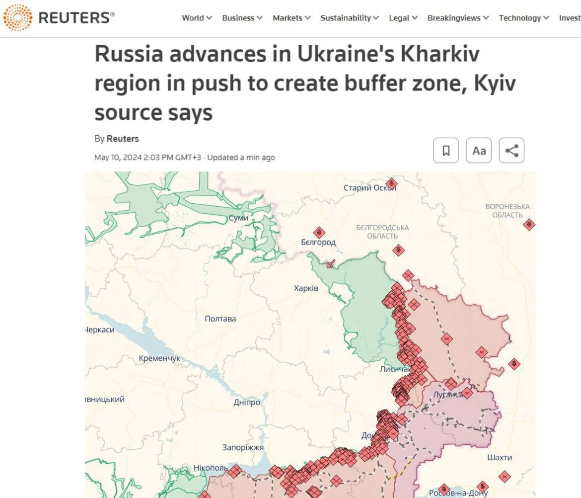 Reuters пишет, что россияне хотели отбросить ВСУ на 10 км от российской границы и создать в Харьковской области буферную зону. Также со ссылкой на высокопоставленный военный источник сообщается, что оккупанты продвинулись на 1 км со стороны Волчанска.