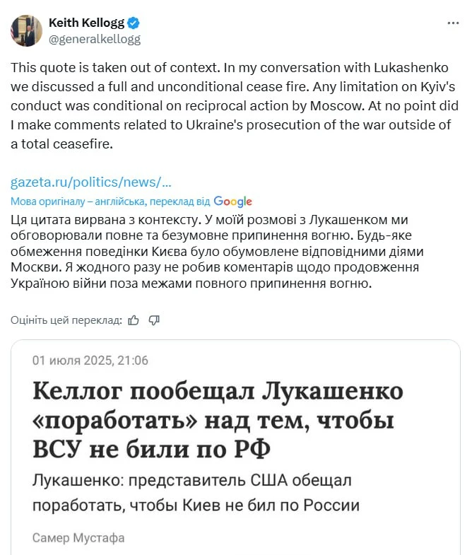 Келлог опроверг якобы обещание Лукашенко ограничить удары Украины по РФ. В X он написал, что его слова вырвали из контекста.
