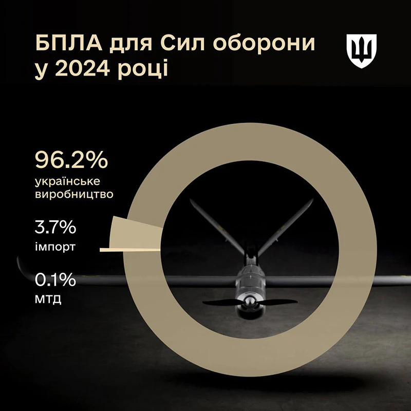 96% дронов, которые использовались украинскими защитниками на фронте этого года, были изготовлены в Украине. Как сообщили в Минобороны страны, в 2024-м украинские предприятия произвели около 1,5 млн разных типов дронов, включая FPV-дроны, самолеты-камикадзе, коптеры-бомберы и разведывательные БПЛА.