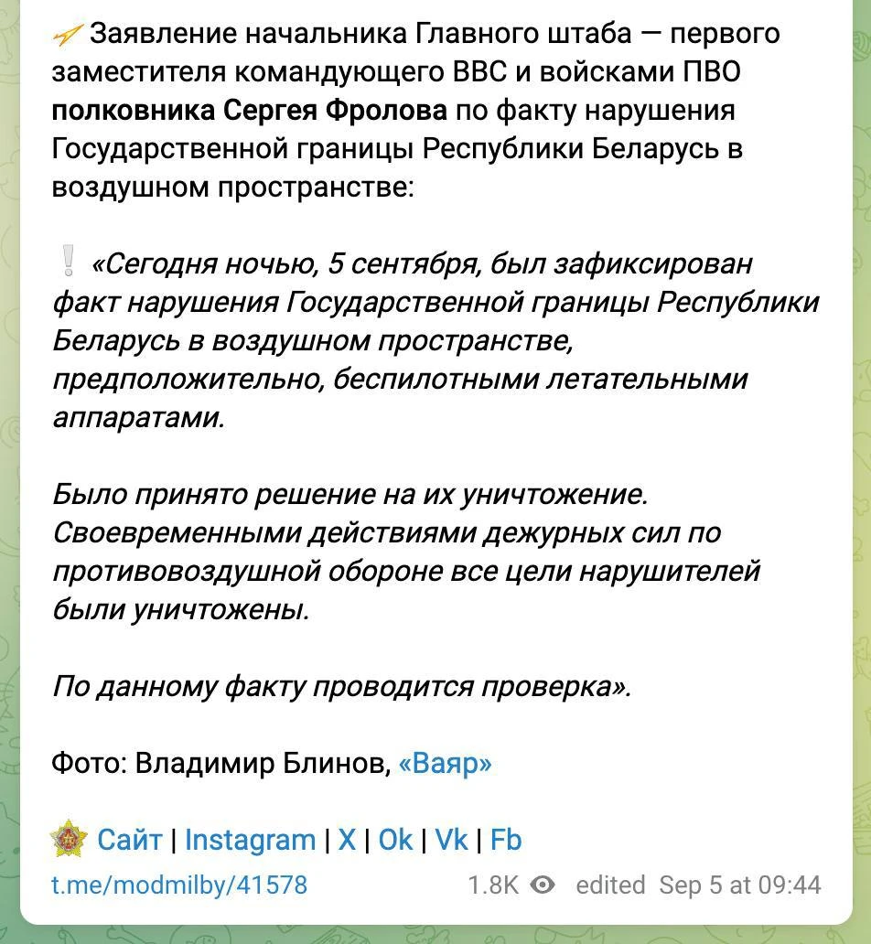 В Минобороны Беларуси официально подтвердили факт работы войск ВВС и зенитно-ракетных войск по дронам этой ночью.