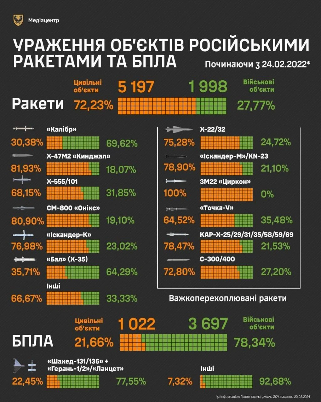 На инфографике, опубликованной ведомством, видно, что по гражданским объектам оккупанты запускают по большей части ракеты, тогда как БПЛА нацелены на военные объекты.